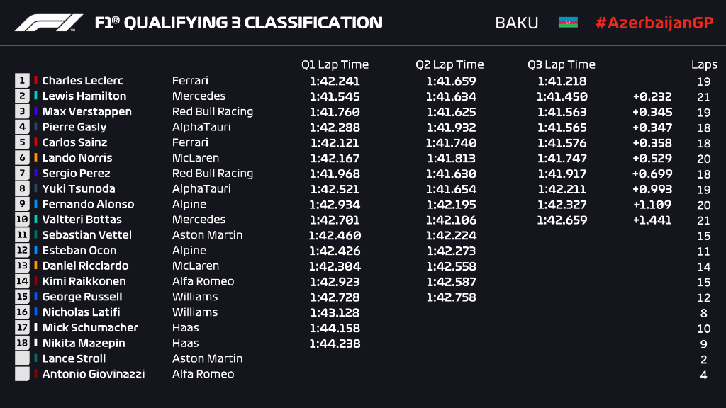 Dermed kunne hverken Lewis Hamilton eller Max Verstappen forbedre sine tider og endte på de to plassene bak Leclerc.