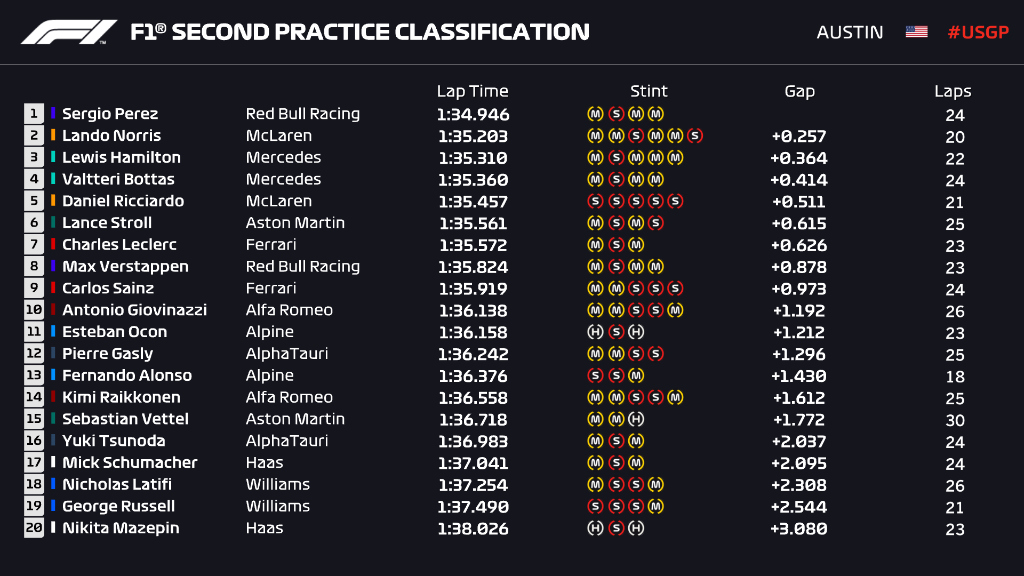Med et kvarter igjen satte Perez en tid på 1.34.946 – noe som gjorde at han avsluttet på topp – foran Lando Norris og Hamilton.