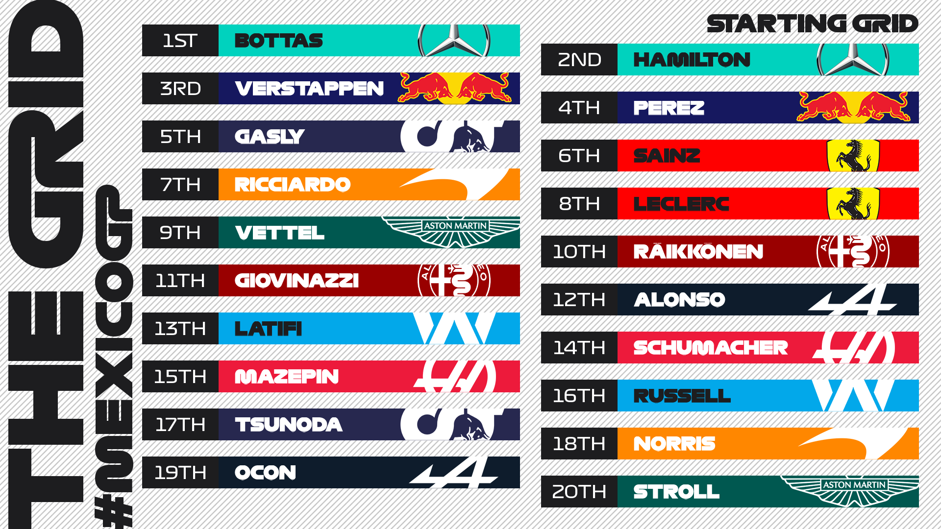 Hjem Nyheter Oppdatert startgrid for Mexico Grand Prix Nyheter Oppdatert startgrid for Mexico Grand Prix 7. november 2021 Sånn ser startgridden ut etter at straffene er utdelt før Mexico Grand Prix.