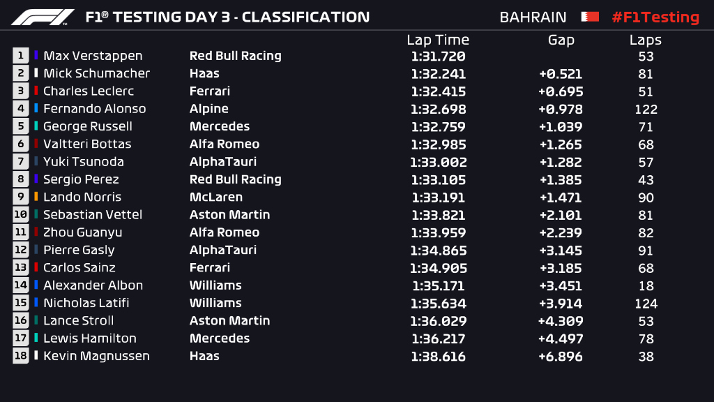 Max Verstappen toppet den siste testdagen i Bahrain – mens Mick Schumacher utnyttet de ekstra to timene med testing til å sette nest beste tid!