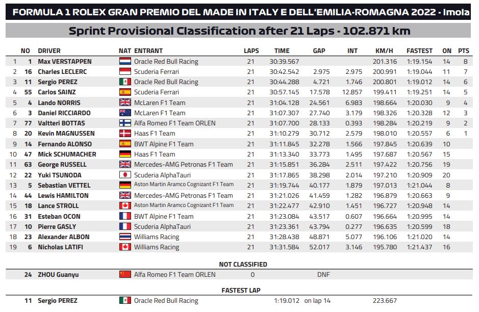 Årets første av totalt tre sprintløp er gjennomført med lørdagens 100 kilometer lange løp på Imola i det som er årets fjerde løpshelg i Formel 1. I første rekke hadde vi som seg hør og bør Max Verstappen i pole position foran Charles Leclerc, i tillegg til at vi hadde en spennende andrerekke med Lando Norris og Kevin Magnussen ved sin side.