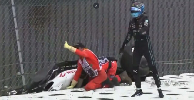 Selv løp George Russell fra sin skadede Mercedes og hoppet opp på barrieren for å se hvordan det gikk med kineseren.