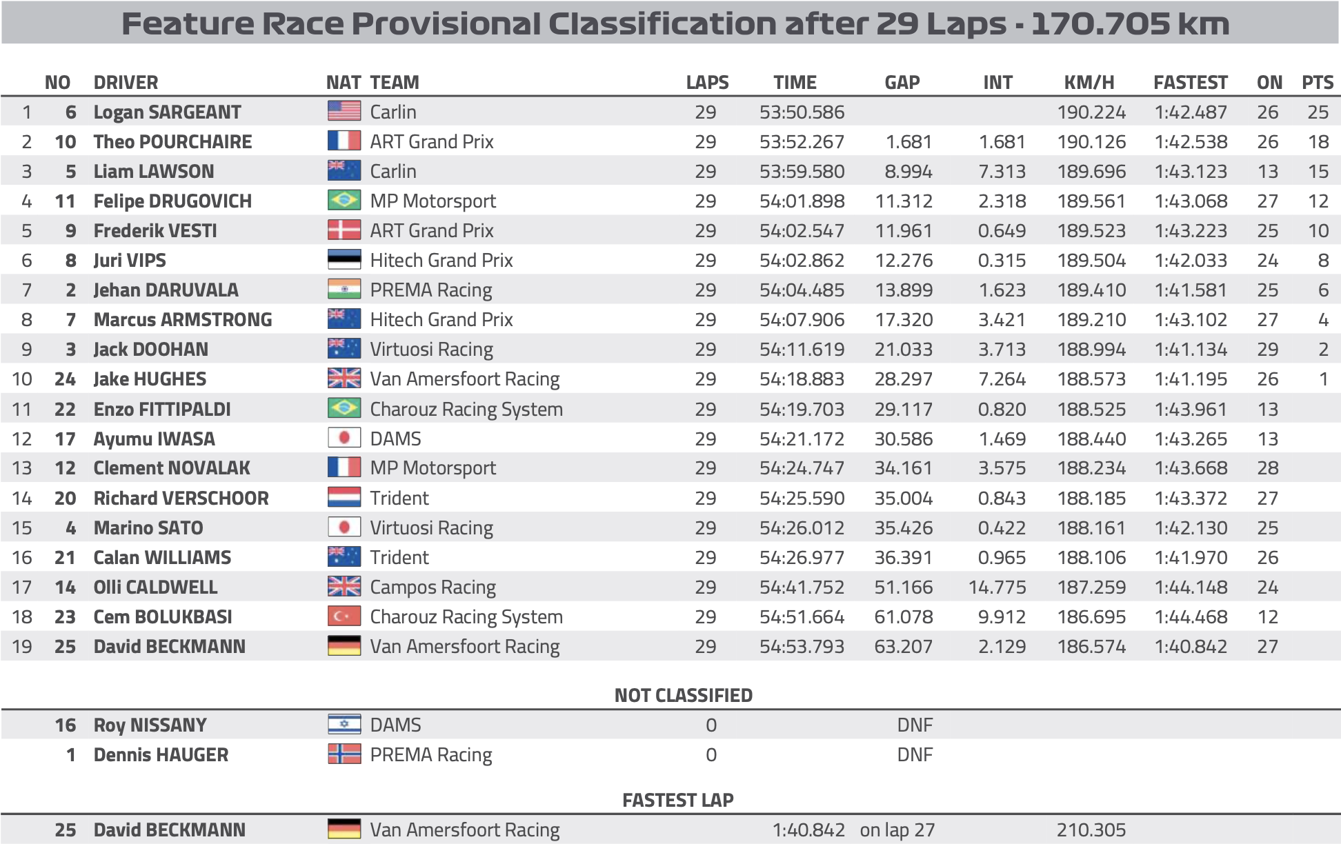 I mesterskapet er det fortsatt Felipe Drugovich som leder an foran Theo Pourchaire. Logan Sargeant hopper med dagens seier opp til en 3. plass. Dennis Hauger startet helgen på 5. plass, men faller ned til en 10. plass etter en tung helg på Silverstone. Se stillingen i fører-mesterskapet nederst!