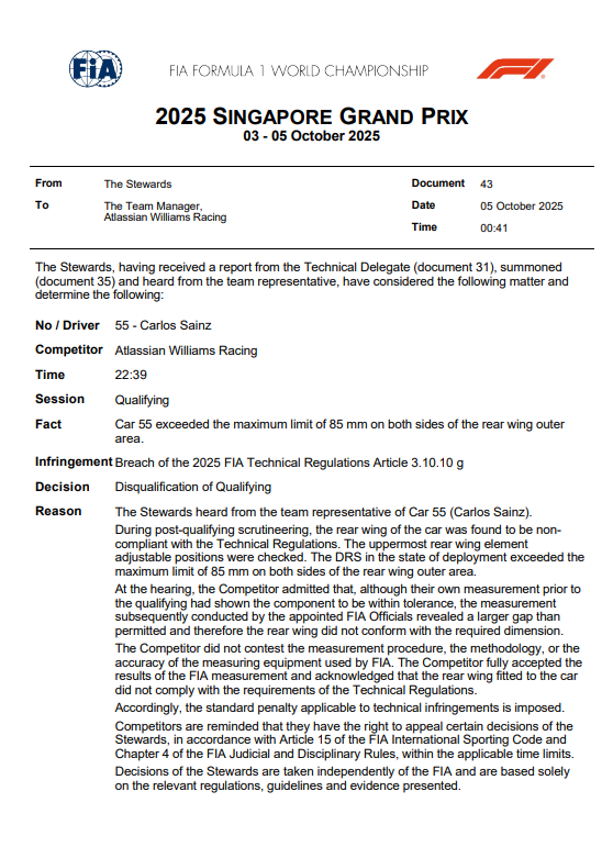 Tekniske overtredelser av denne typen behandles som svart-på-hvitt, gir diskvalifikasjon fra kvalifiseringen. Dermed må både Sainz og Albon starte bakerst på griden i søndagens løp på Marina Bay.