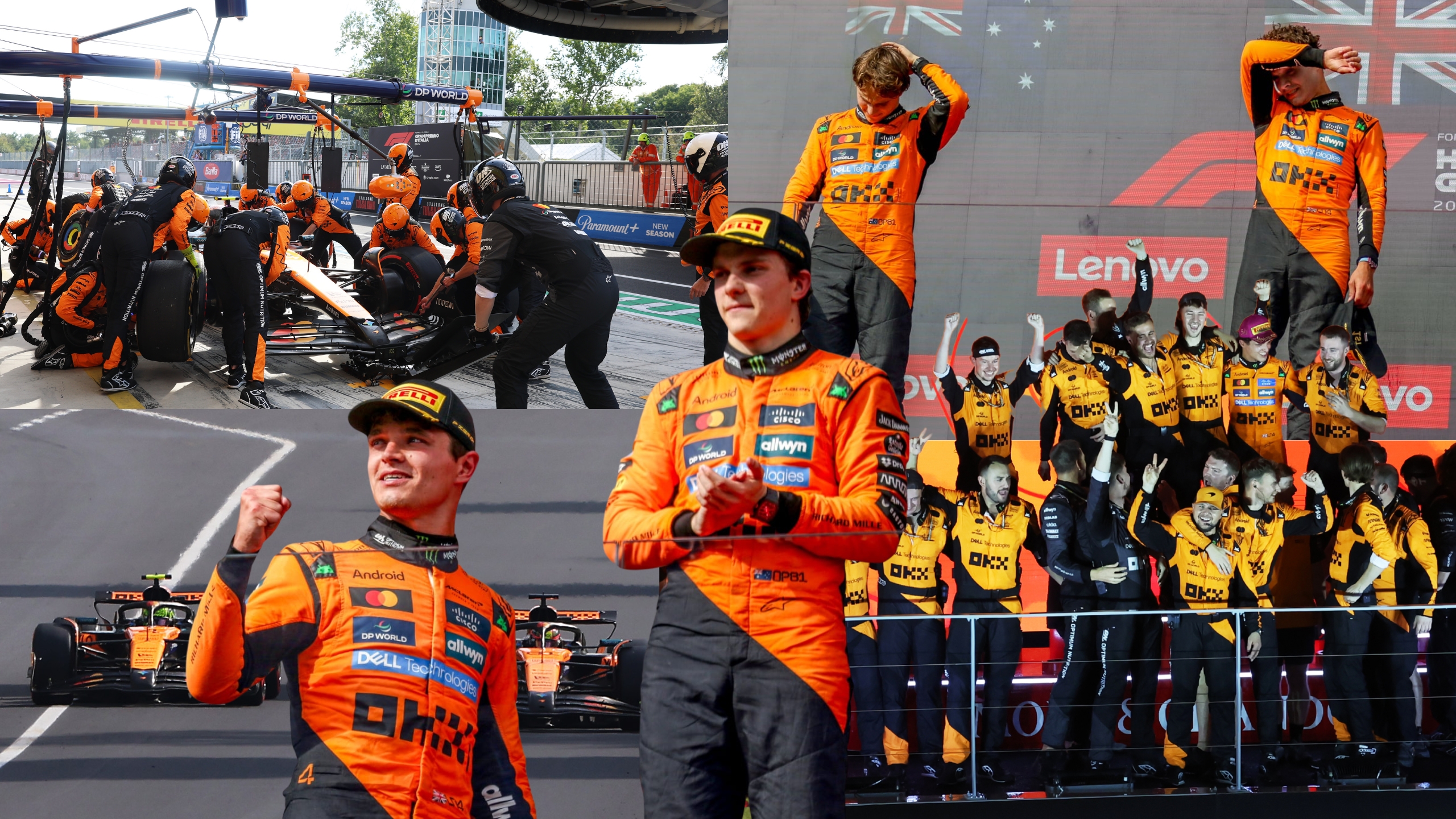 Tre løp senere rullet Formel 1-sirkuset av gårde på lynraske Monza. Norris startet i pole position foran Oscar Piastri, og holdt først unna, men et par svinger senere kom Piastri seg forbi ved en tøff forbikjøring.